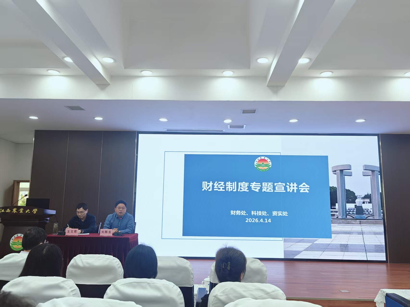 20264月14日上午,财务处联合科技处、资实处在校办一楼报告厅召开财经制度专题宣讲会。省纪委省监委驻江西农业大学纪检监察组组长、校党委常委、纪委书记刘斯龙出席会议并讲话,校党委常委、副校长王文君主持会议,校属各单位财务负责人及相关工作人员参加会议。会上,财务处、科技处、资实处负责同志分别围绕经费支出管理办法修订内容、科研经费管理相关政策、货物类及服务类项目申购与管理新要求进行宣讲解读并现场答疑。会议指出,制度的生命力在于执行,要深刻把握制度管权的重要性,坚持把权力关进制度的笼子,做到...